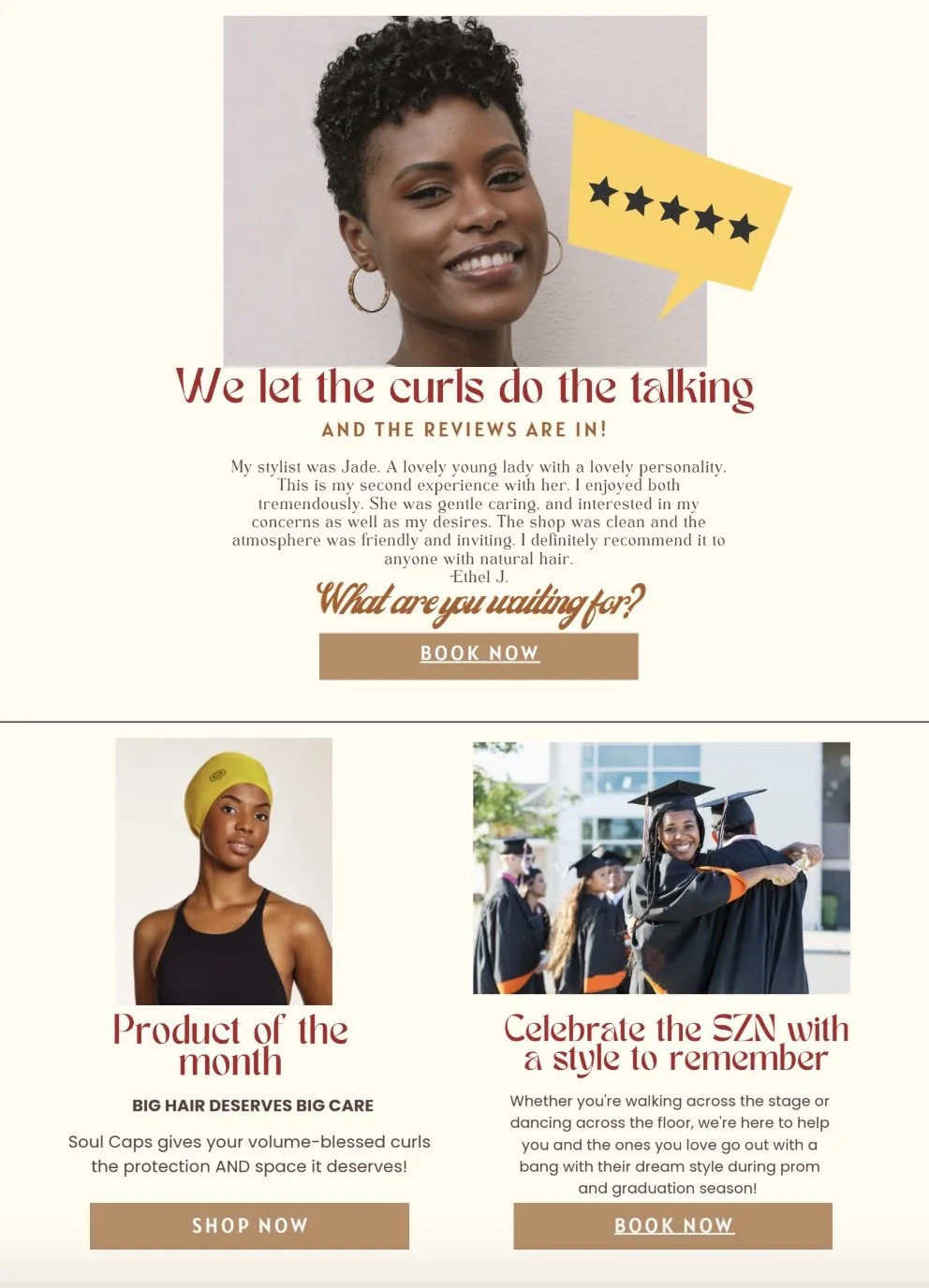 Kinks and Curls Natural Hair Salon needed a newsletter that could do it all: spotlight events, highlight glowing customer reviews, showcase products as they built out their online store, and educate customers on the emerging role of AI in the natural hair space.