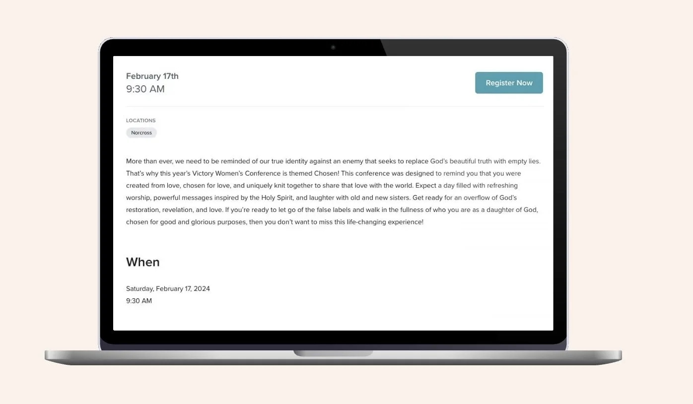 Victory’s Women’s Ministry was preparing for its 2024 conference, centered around the powerful theme: Chosen—a call for women to recognize their God-given identity and purpose. To bring the message to life and drive engagement, they needed compelling copy across multiple channels, including: